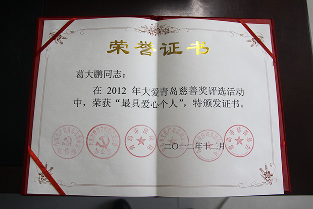 12月30日晚,青島市慈善總會(huì)2013年慈心童行元旦慈善晚宴在黃島飯店舉行。會(huì)上對(duì)2012年度“大愛青島慈善獎(jiǎng)”評(píng)出的在助醫(yī)、助學(xué)、安老、慈孤、賑災(zāi)、義工服務(wù)等方面,做出突出貢獻(xiàn)的27個(gè)集體和50名愛心個(gè)人進(jìn)行了表彰。海利爾藥業(yè)集團(tuán)副總裁葛大鵬榮獲“最具愛心個(gè)人”榮耀稱號(hào)。????????