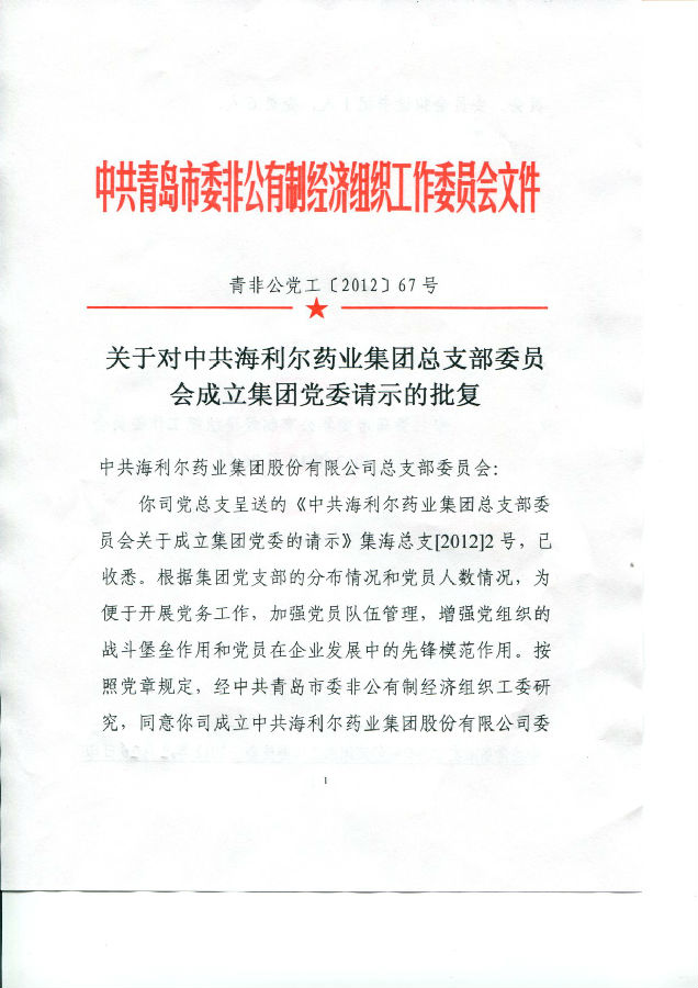 ——中共青島市委非公有制經(jīng)濟(jì)組織工作委員會(huì)批復(fù),海利爾藥業(yè)集團(tuán)黨總支升格為黨委