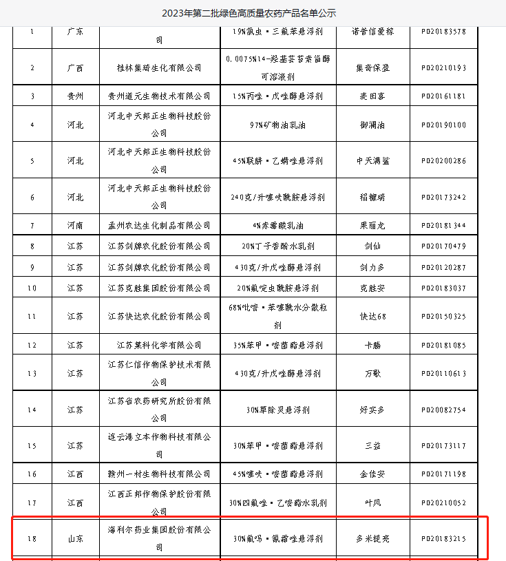 ? ? ? ? 參照T/CCPIA 170-2021《綠色高質(zhì)量農(nóng)藥產(chǎn)品評(píng)價(jià)規(guī)范》團(tuán)體標(biāo)準(zhǔn)為基礎(chǔ),中國(guó)農(nóng)藥工業(yè)協(xié)會(huì)開展了綠色高質(zhì)量農(nóng)藥產(chǎn)品申報(bào)工作。最終,經(jīng)協(xié)會(huì)形式審查并組織專家綜合審定,由農(nóng)藥生產(chǎn)/經(jīng)營(yíng)單位自愿申報(bào)的43個(gè)產(chǎn)品中有36個(gè)產(chǎn)品符合T/CCPIA 170-2021標(biāo)準(zhǔn)要求并進(jìn)入了“第二批綠色高質(zhì)量農(nóng)藥產(chǎn)品公示名單”。海利爾藥業(yè)集團(tuán)股份有限公司專利產(chǎn)品多米提亮(有效成分:20%氟嗎啉 · 10%氰霜唑懸浮劑成功入圍名單。