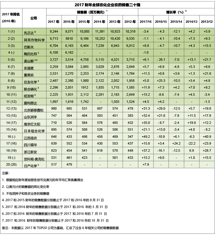 縱觀2017年TOP 20 榜單,前6強呈現(xiàn)出新的變化:陶氏化學(xué)和杜邦成功合體,首次以合體后的名稱”陶氏杜邦”出現(xiàn)在榜單的第四位,基于此,安道麥上升至該榜單的第六位。就業(yè)績增長率而言,除了先正達、拜耳及陶氏杜邦,其他所有公司2017年銷售額均實現(xiàn)不同程度的增長。其中,有11家公司實現(xiàn)了兩位數(shù)的增長率;增幅最為明顯的當(dāng)屬中國軍團,上榜的6家公司中,有5家公司的業(yè)績增幅超出30%。2017 年TOP 20企業(yè)合計銷售額達到551.9 億美元,比2016年增長約5.2%,公司入圍門檻再次回歸到2013年的5億美元,新TOP 5公司銷售額占榜單總計金額的62%。
