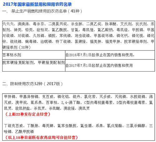 ??? 也就是說只有獲得定點經(jīng)營資格的農(nóng)藥經(jīng)營點才可以銷售以上農(nóng)藥,不過根據(jù)農(nóng)業(yè)農(nóng)村部2017年出臺的《限制使用農(nóng)藥名錄(2017版)》,里面標(biāo)注的限制使用農(nóng)藥共有32種,其中就包括目前使用量較大的毒死蜱、丁硫克百威、樂果這些產(chǎn)品。