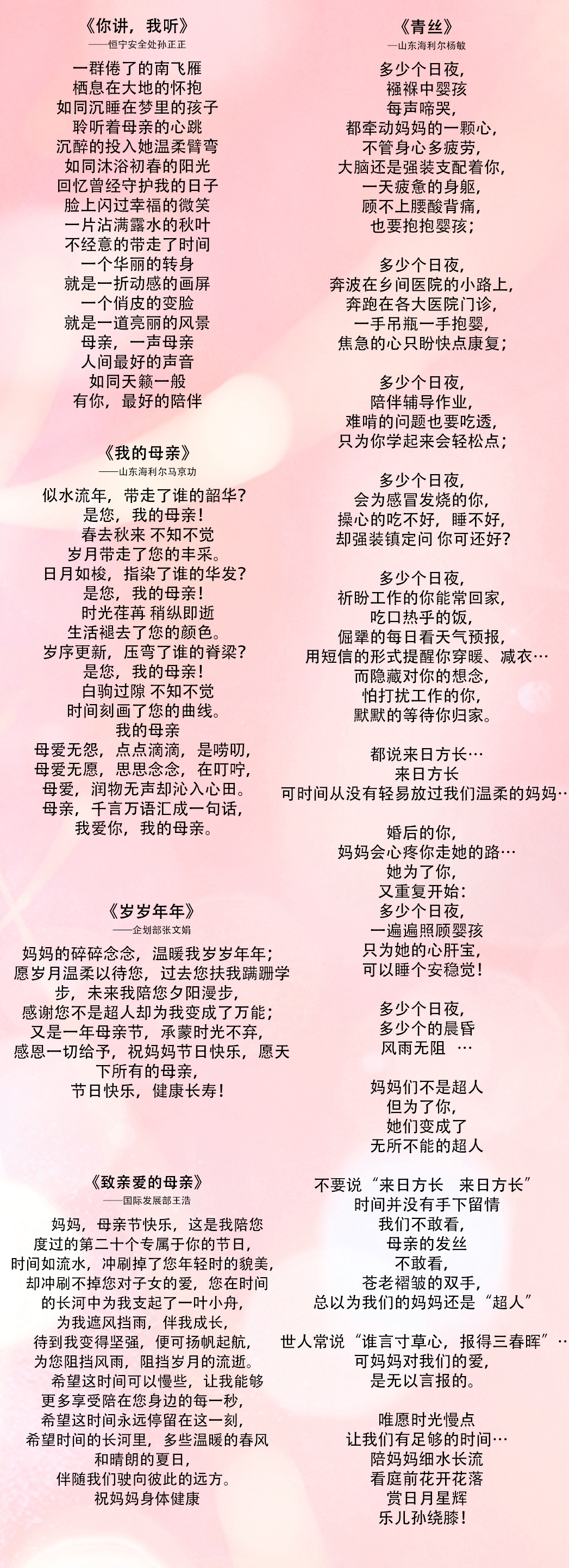 ? ? ? 經(jīng)三天投票評(píng)選,現(xiàn)對(duì)參與活動(dòng)的部分優(yōu)秀作品進(jìn)行展示,一起來(lái)感受對(duì)媽媽們的愛(ài)與祝福!