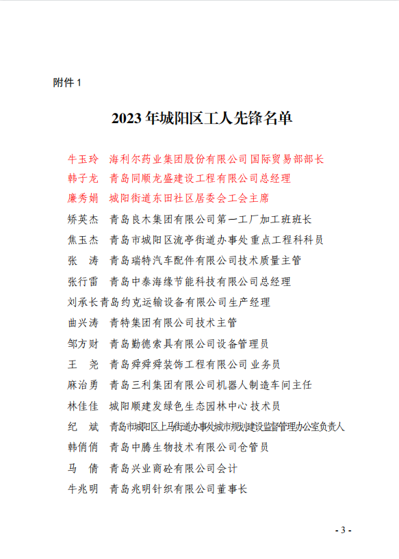 ? ? ? ?在“五一”國(guó)際勞動(dòng)節(jié)來(lái)臨之際,為學(xué)習(xí)先進(jìn)、樹立榜樣,進(jìn)一步激發(fā)全區(qū)職工干事創(chuàng)業(yè)、爭(zhēng)先創(chuàng)優(yōu)積極性,城陽(yáng)區(qū)總工會(huì)公布了2023年城陽(yáng)區(qū)工人先鋒、工人先鋒號(hào)名單,海利爾藥業(yè)集團(tuán)國(guó)際貿(mào)易部部長(zhǎng)牛玉玲等30名“城陽(yáng)區(qū)工人先鋒”受到表彰。