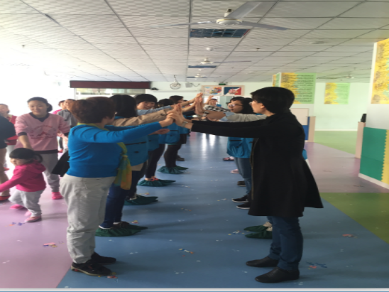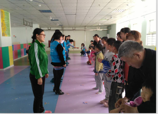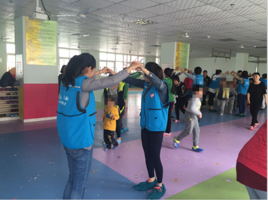 接下來就是“快樂的小火車”游戲,志愿者們主動(dòng)搭起了“火車軌道”。
