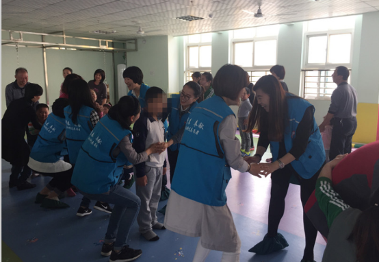 走到二樓活動(dòng)室,正好趕上他們互動(dòng)游戲課程,這些孩子對陌生人都有一定的抵觸感,所以在老師的引導(dǎo)下,志愿者們通過簡單的互動(dòng)、自我介紹、擁抱等方式建立了初步友誼,小朋友們慢慢的笑起來。