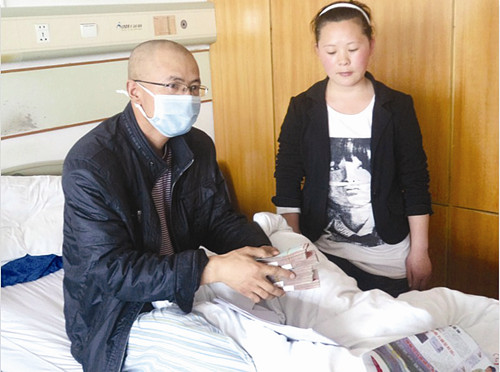 “如果這100元錢能夠延長我親愛的同事一秒鐘的生命,那也是非常值得的……”讀著同事們寫在紙上的祝福話,身患急性白血病的于昆眼淚不停地在眼眶里打轉(zhuǎn)。日前,青島海利爾藥業(yè)集團(tuán)股份有限公司工作人員將1500余名職工自發(fā)捐獻(xiàn)的6萬余元愛心款送到了職工于昆的手中(上圖),幫助他積極治療。